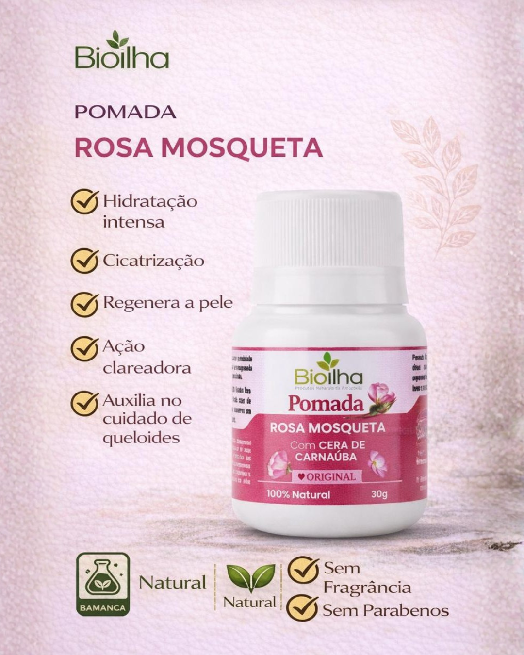A Pomada Natural de Rosa Mosqueta com Cera de Carnaúba Bioilha foi desenvolvida para proporcionar cuidado intenso, hidratação profunda e auxílio na regeneração da pele. Formulada com ingredientes de origem vegetal e sustentável, é ideal para quem busca um produto seguro, eficaz e livre de fragrância cosmética.